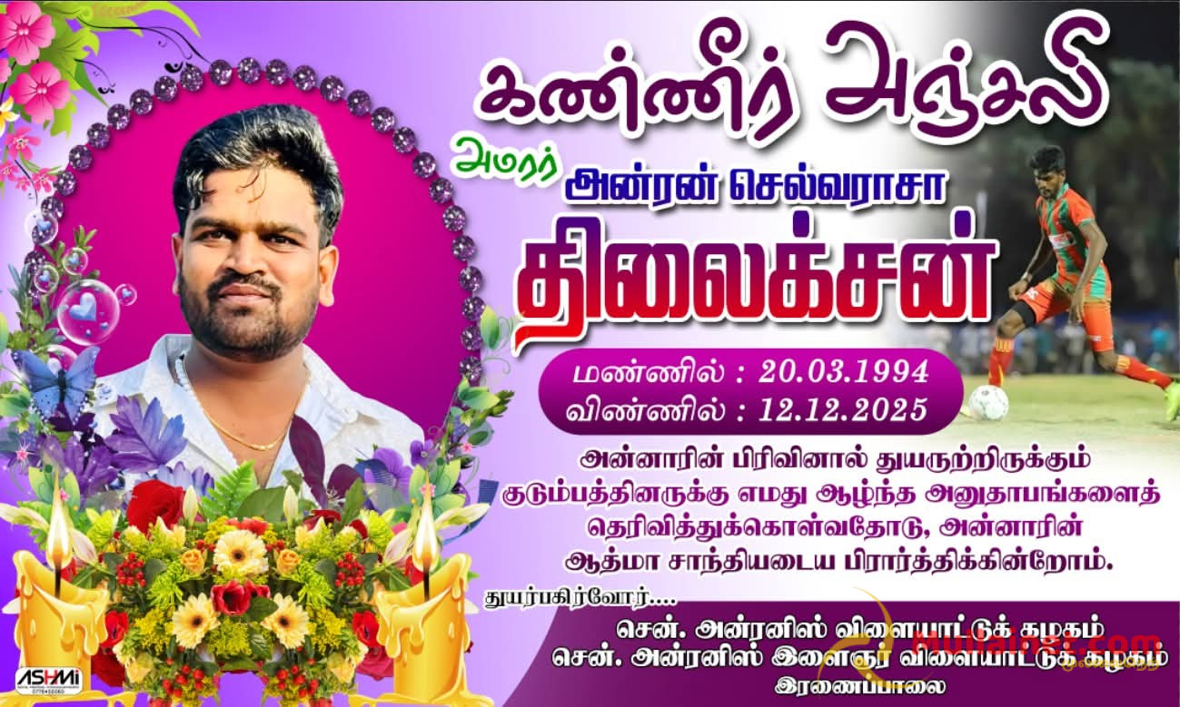 முல்லைத்தீவு மாவட்டம் புதுக்குடியிருப்பு பிரதேசத்திற்கு உட்பட்ட இரணைப்பாலை வீதியில் கடந்த 09.12.2025 அன்று இடம்பெற்ற வீதி விபத்தில் காயமடைந்த குடும்பஸ்தர் ஒருவர், சிகிச்சை பலனின்றி 12.12.2025 அன்று உயிரிழந்துள்ளார்.