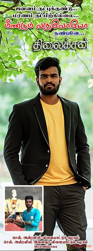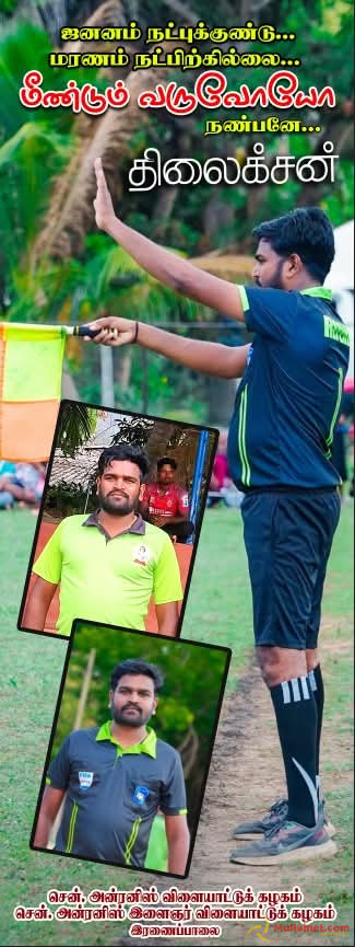 கடந்த 9ஆம் திகதி இரணைப்பாலை வீதியில் உந்துருளியில் பயணித்துக்கொண்டிருந்த திலைக்சன், அதே வீதியால் பயணித்த கனரக வாகனமொன்றுடன் மோதி விபத்துக்குள்ளாகியுள்ளார். விபத்தில் கடுமையாக காயமடைந்த அவர் உடனடியாக முல்லைத்தீவு மாவட்ட மருத்துவமனையில் அனுமதிக்கப்பட்டு, மேலதிக சிகிச்சைக்காக யாழ்ப்பாண போதனா மருத்துவமனைக்கு மாற்றப்பட்டு சிகிச்சை பெற்று வந்த நிலையில் உயிரிழந்துள்ளார்.