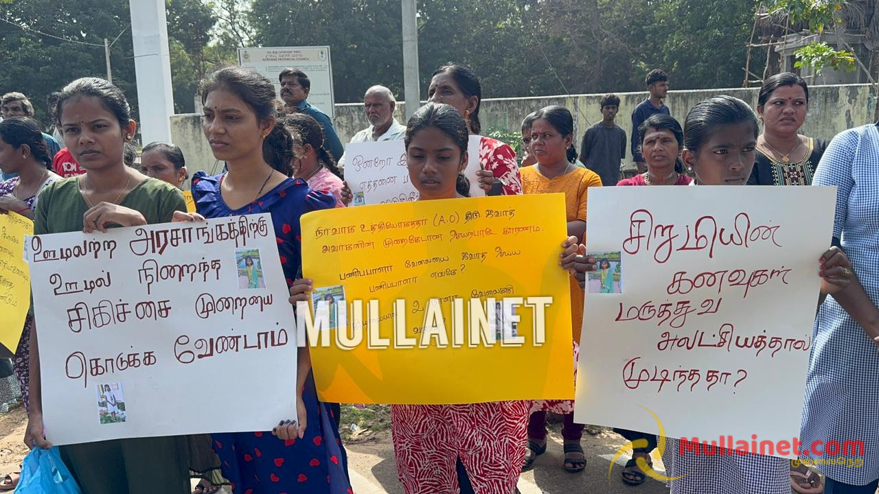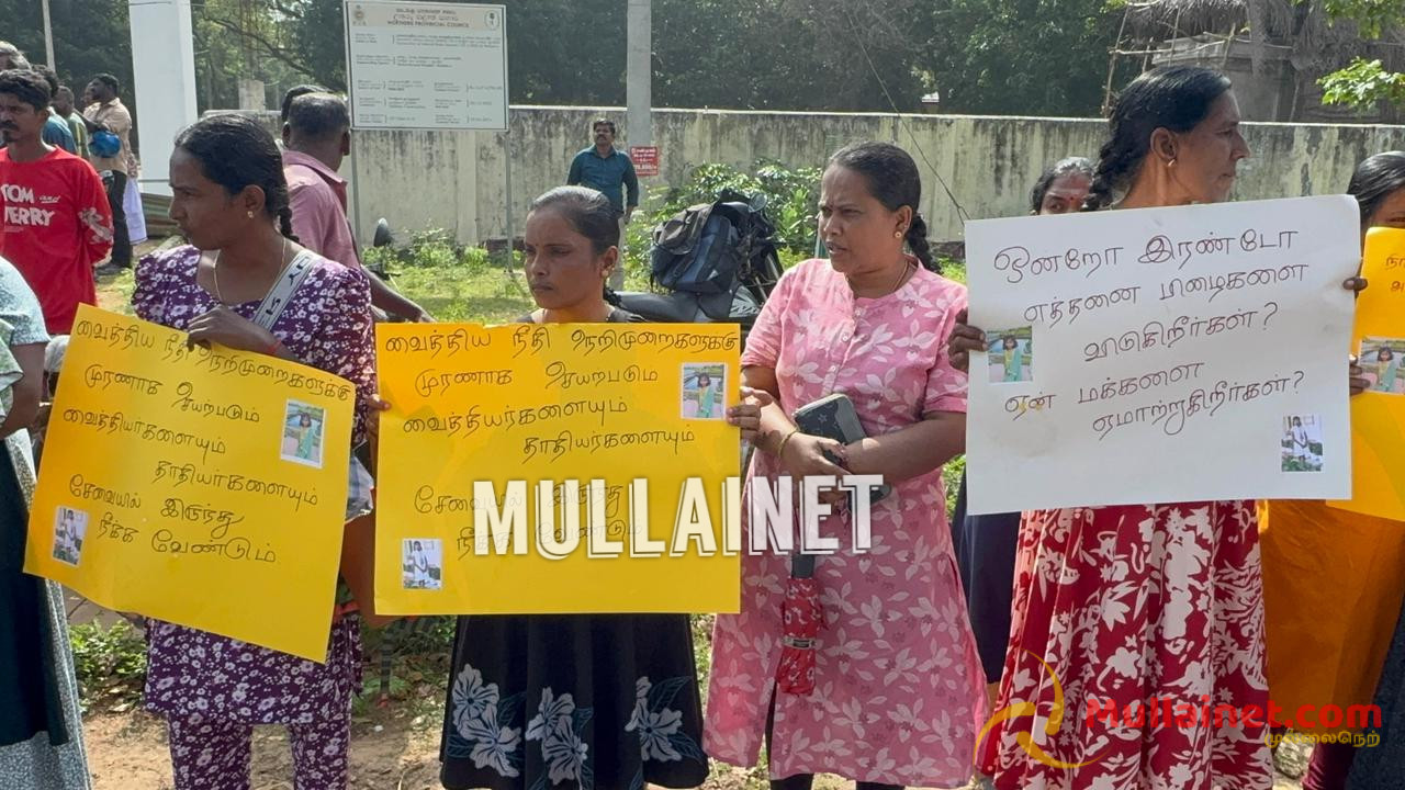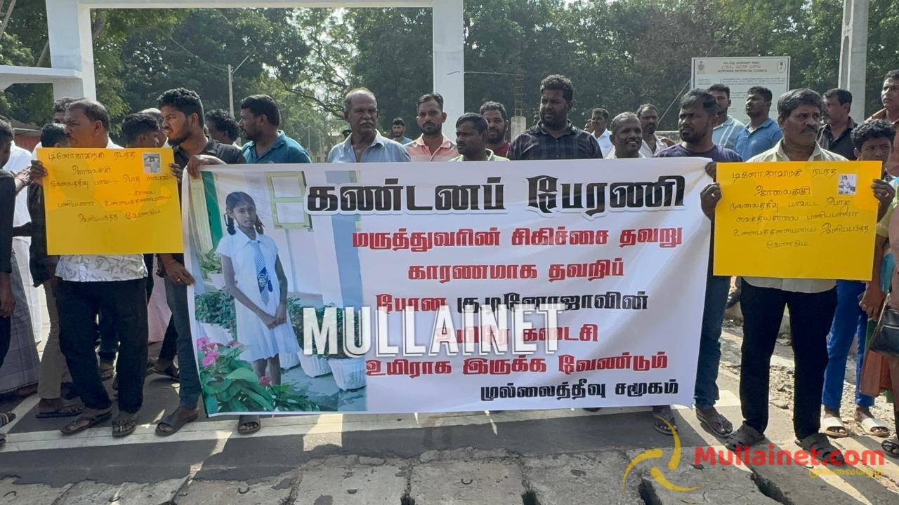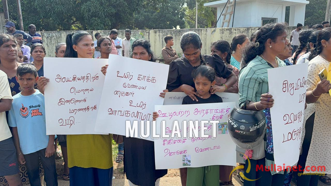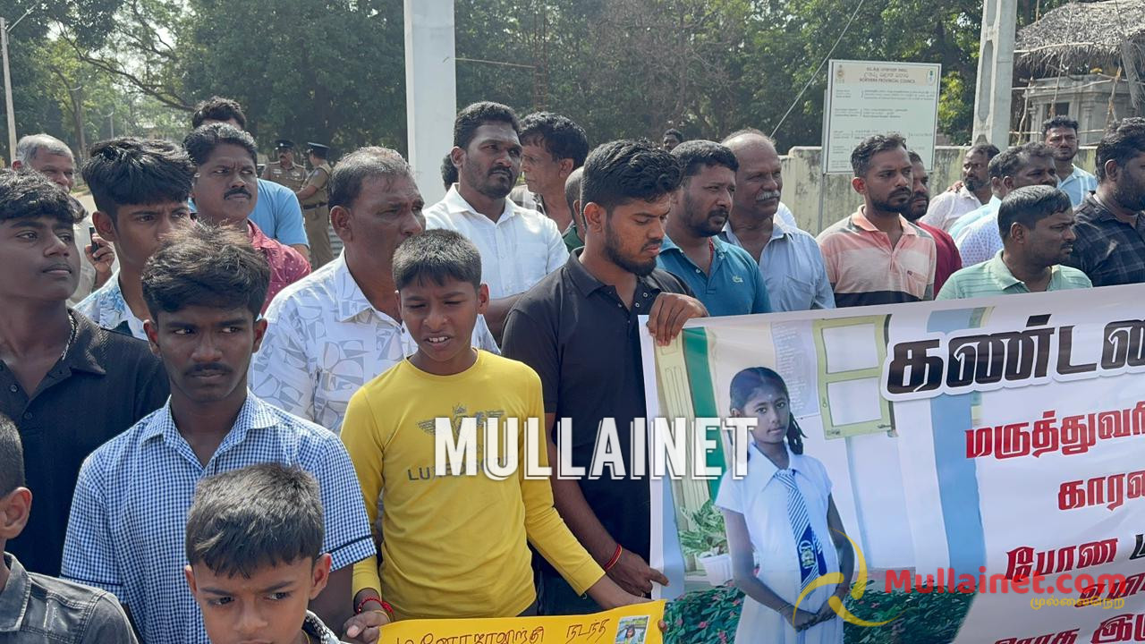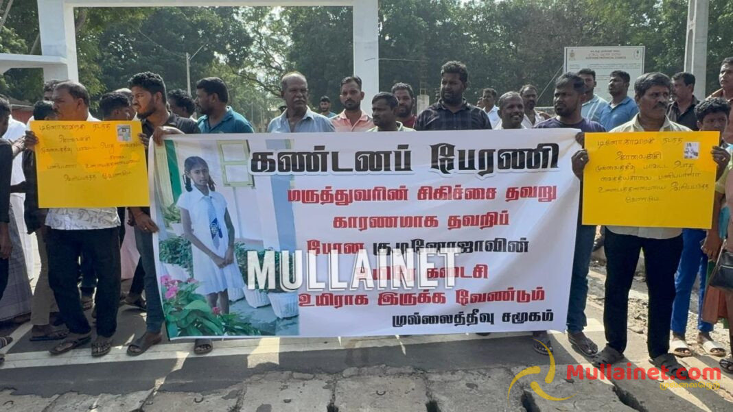 கடந்த 21.12.2025 அன்று முல்லைத்தீவு சிலாவத்தை பகுதியில் வசிக்கும் குகநேசன் டினோயா எனும் 13 வயது சிறுமி சாதாரண உணவு ஒவ்வாமை காரணமாக மாஞ்சோலை வைத்தியசாலையில் அனுமதிக்கப்பட்ட நிலையில் மரணமடைந்திருந்தார். குறித்த சிறுமியின் மரணத்தில் சந்தேகம் இருப்பதாகவும், குறித்த சிறுமியின் மரணத்திற்கு நீதிகோரியும், இனியும் இவ்வாறானதொரு இழப்பு ஏற்படாதிருக்கவும் முல்லைத்தீவு மக்கள் சமூகத்தினரால் இன்றையதினம் (29.12.2025) காலை 10 மணியளவில் கண்டன போராட்டம் ஒன்று முன்னெடுக்கப்பட்டிருந்தது.