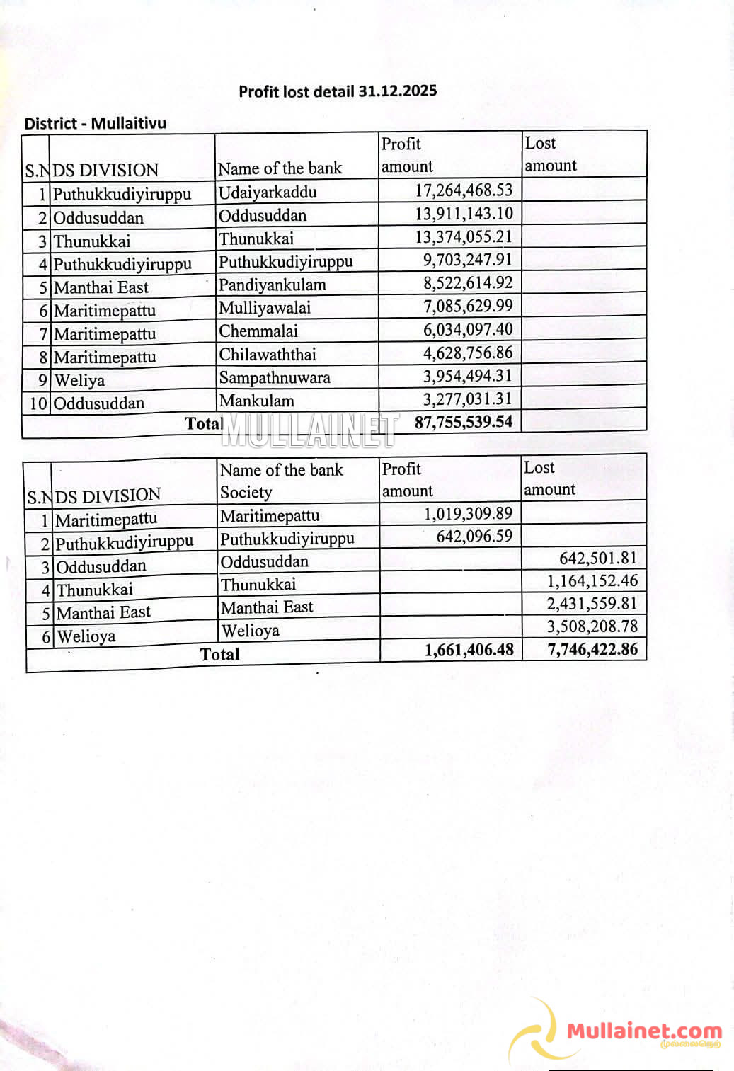 கடந்த வருடத்தைப் போலவே, உடையார்கட்டு சமுர்த்தி வங்கி இந்த வருடமும் முதலாம் இடத்தினை தக்க வைத்துக் கொண்டு மீண்டும் ஒரு சாதனையை நிகழ்த்தியுள்ளது. அதேவேளை, புதுக்குடியிருப்பு சமுர்த்தி வங்கி கடந்த ஆண்டுடன் ஒப்பிடுகையில் ஒரு படி முன்னேறி 4ஆம் இடத்தினை பெற்று வரலாற்றுச் சாதனை புரிந்துள்ளது.