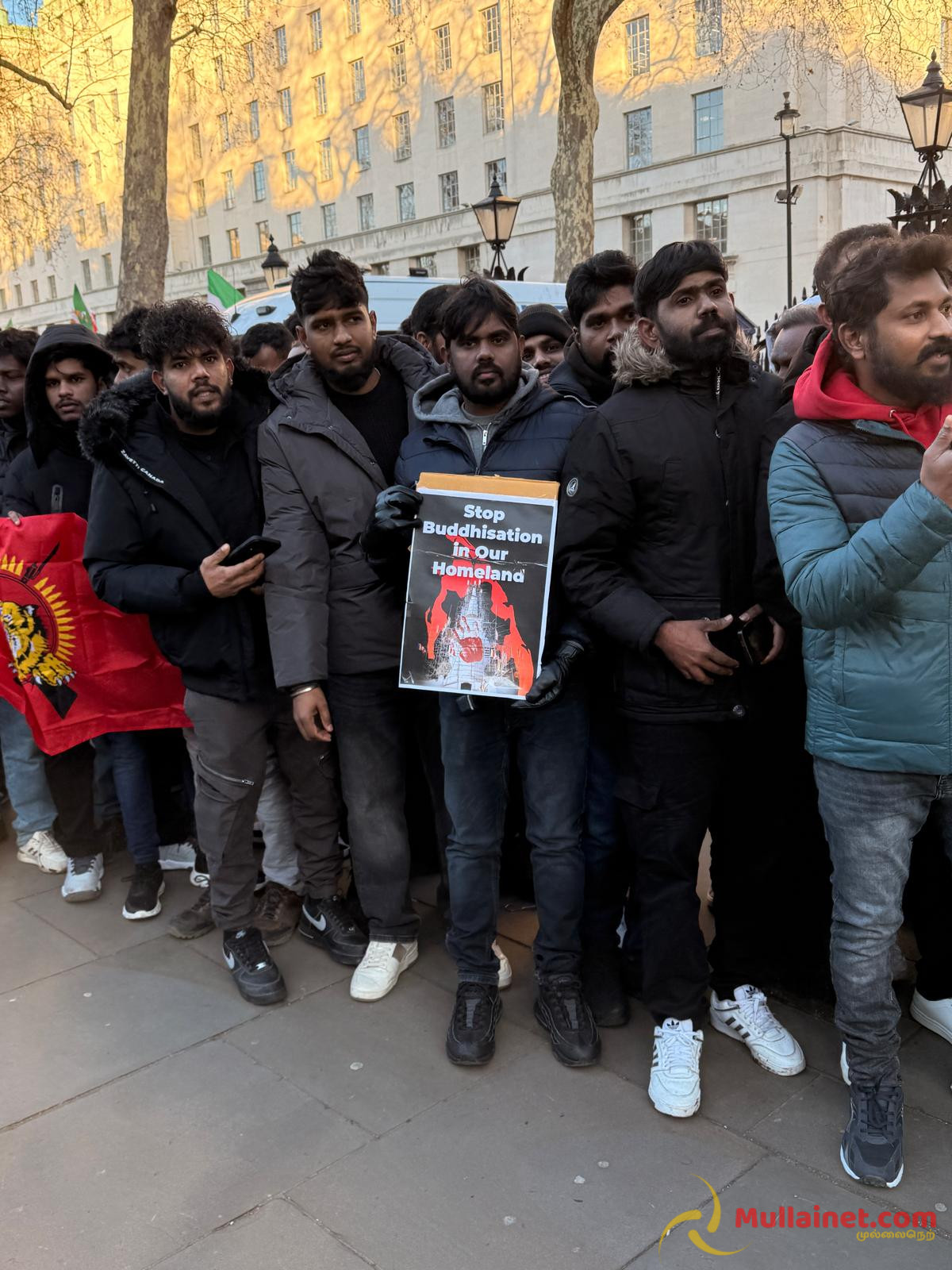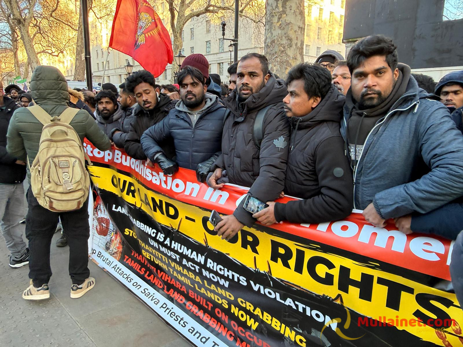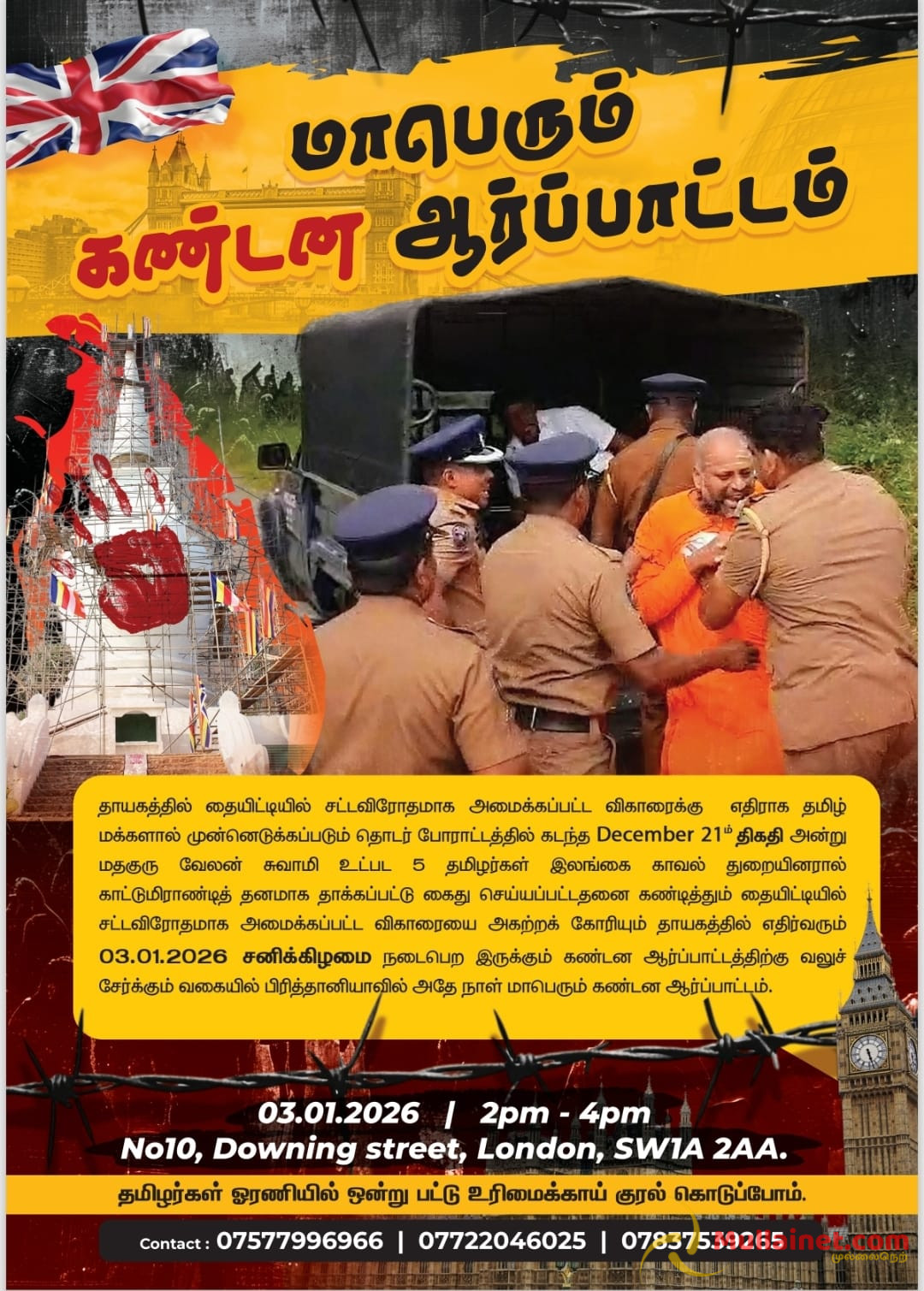 யாழ்ப்பாணம் தையிட்டியில் சட்டவிரோதமாக அமைக்கப்பட்ட விகாரைக்கு எதிராக மக்களால் முன்னெடுக்கப்படும் தொடர் போராட்டத்தில் கடந்த மார்கழி 21ம் திகதி அன்று மதகுரு வேலன் சுவாமி உட்பட 5 தமிழர்கள் இலங்கை காவல் துறையினரால் காட்டுமிராண்டித் தனமாக தாக்கப்பட்டு கைது செய்யப்பட்டதனை கண்டித்தும், தையிட்டியில் சட்டவிரோதமாக அமைக்கப்பட்ட விகாரையை அகற்றக் கோரியும் நேற்றையதினம் (03.01.2026) சனிக்கிழமை லண்டன் டோவ்னிங் (Downing street) பகுதியில் மாபெரும் கண்டன ஆர்ப்பாட்டம் இடம்பெற்றிருந்தது.
