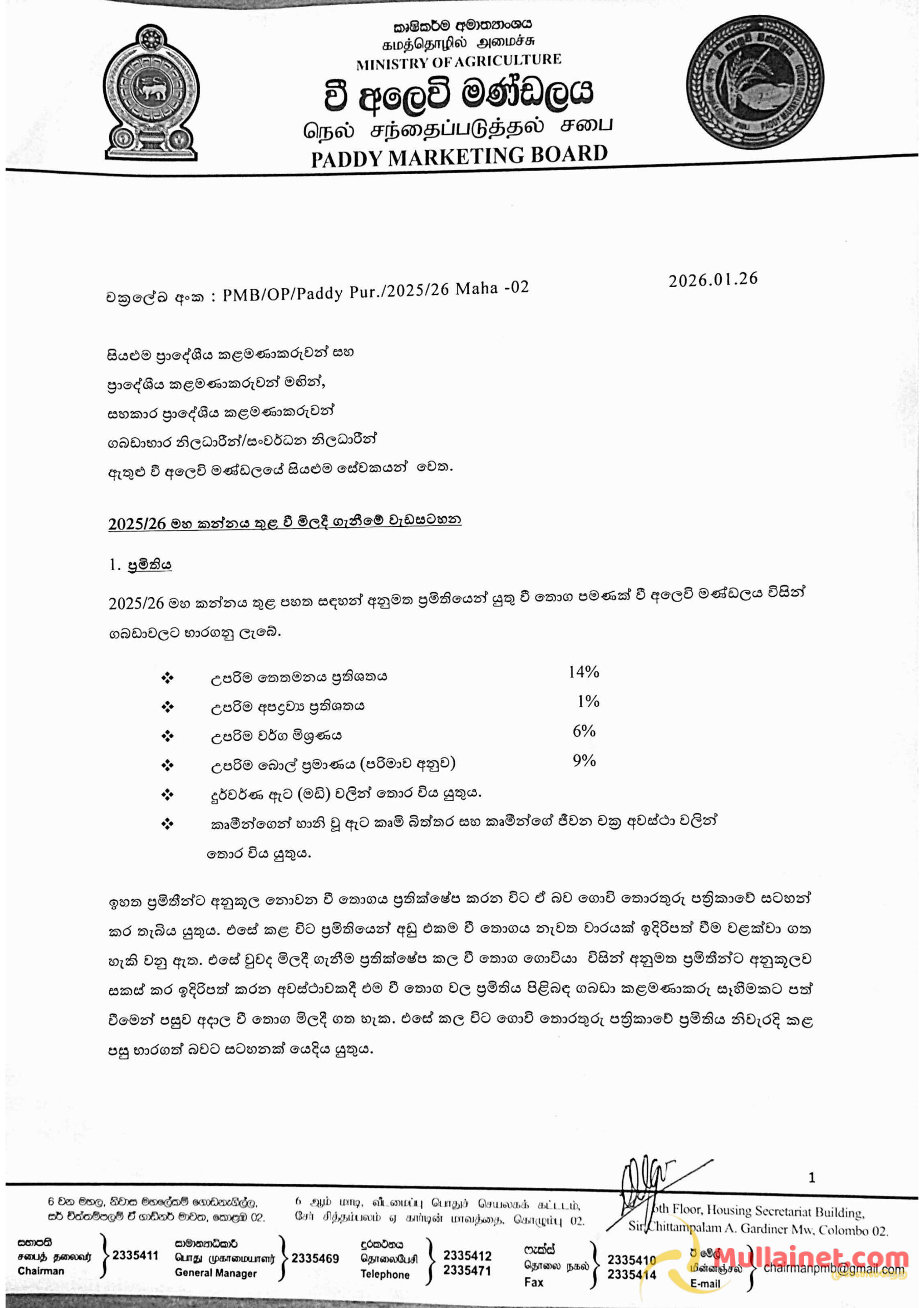 அந்தவகையில் வெள்ளை, சிவப்பு நாட்டரிசி – கிலோ120, சிவப்பு, வெள்ளை சம்பா -கிலோ130, கீரிசம்பா கிலோ-140, ரூபாய்க்கும் கொள்வனவு செய்யப்பட இருக்கின்றது. அத்தோடு கொள்வனவு செய்யப்படும் நெல் ஈரப்பதன் 14 வீதத்திற்குள்ளாக இருக்க வேண்டும். நெல்லுடன் ஏனைய கலப்படங்கள் 1 வீதத்திற்குட்பட்டதாகவும் ஏனைய நெல்லினங்களின் கலப்பு 6 வீதத்திற்குட்பட்டதாகவும் சப்பி 9 வீதத்திற்குட்பட்டதாக இருக்க வேண்டும் என அறிவிக்கப்பட்டுள்ளது.