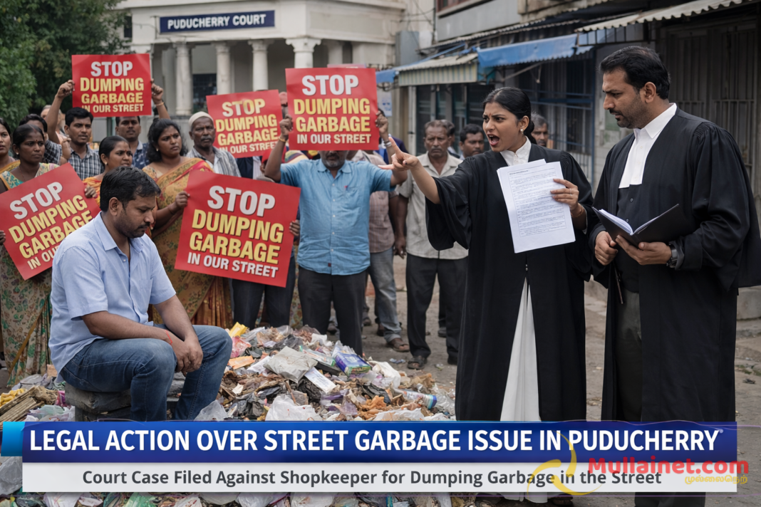 முல்லைத்தீவு புதுக்குடியிருப்பு நகரில் இயங்கி வரும் வர்த்தக நிலையம் ஒன்றின் உரிமையாளர், வர்த்தக நிலையத்திற்கு முன்பாக வீதியில் குப்பைகளை கொட்டிய வர்த்தகருக்கு எதிராக சுகாதார பரிசோதகர்களால் சட்ட நடவடிக்கை எடுக்கப்பட்டு, வழக்கு தாக்கல் செய்யப்பட்டது.